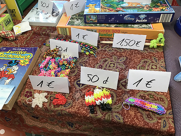 Am Morgen fing es damit an, dass wir alles aufgebaut haben und einen Freund / eine Freundin gesucht haben, mit dem/der wir den Stand gemeinsam machen wollten. (Ach ja: Wir mussten zu Hause auch noch Sachen raussuchen, die wir verkaufen wollten, und mit Preisen beschriften.)