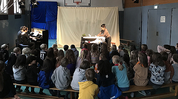 Das Ensemble, bestehend aus der für das "Mensch, Puppe!"-Figurentheater tätigen Schauspielerin Claudia Spörri und dem Klavierduo Marina Kondraschewa und Sebastian Chica, führte das Stück "Die Bremer Stadtmusikanten - Ein musikalisches Märchen für Klavier zu vier Händen und Sprecher nach dem Text der Gebrüder Grimm" von Oliver Kolb auf.